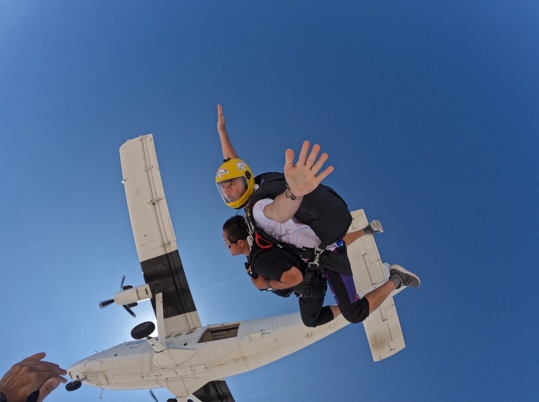 Tandem skydivers freefalling over desert landscapes with the sea in the distance.